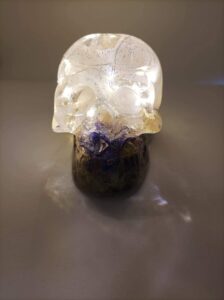Design Envoûtant : Le haut du crâne est un cristal transparent, moucheté de paillettes et abritant une guirlande de LED intégrée (oui, ça brille !).